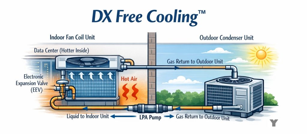 Liquid Pressure Amplification (LPA®) enables DX free cooling by maintaining stable refrigerant flow and pressure differential during low‑ambient operation—conditions where conventional DX systems typically struggle.